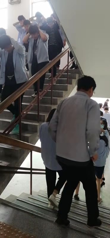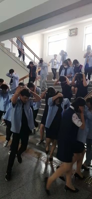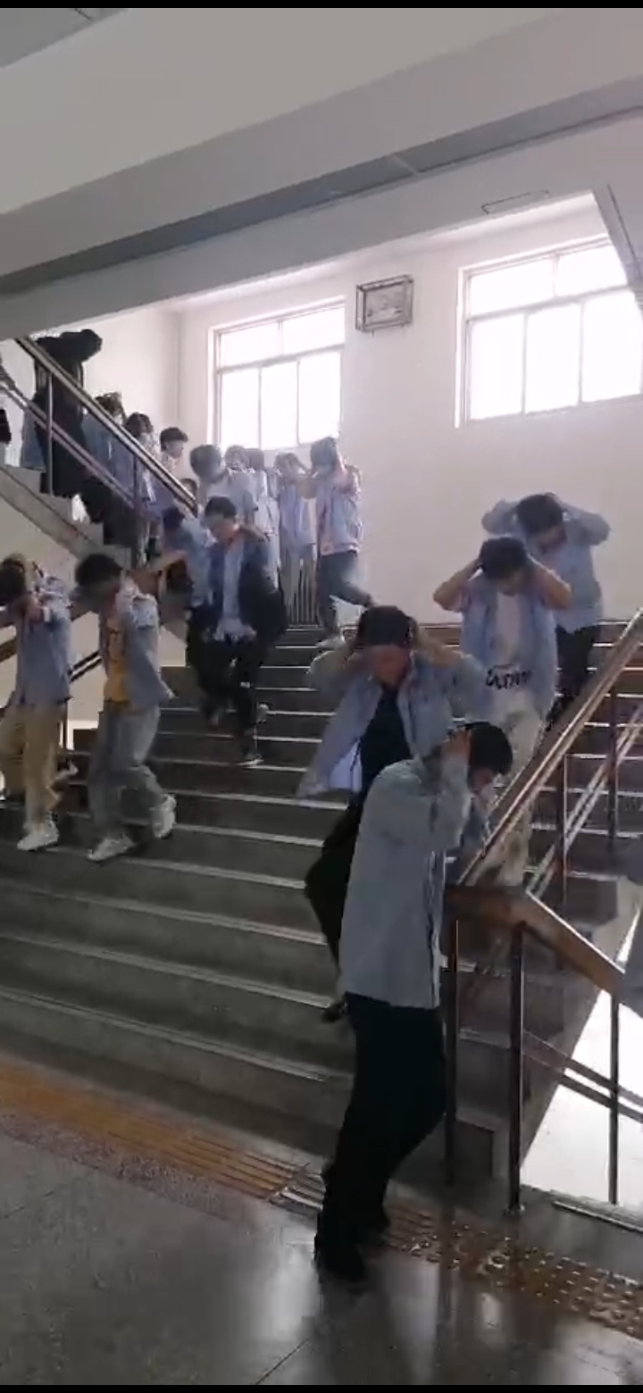 第二次警报响起,主震结束,全校师生进行紧急疏散。班内老师组织学生从指定消防路线迅速撤离。负责疏导楼梯、走廊的老师则 坚守岗位,直到最后一名学生通过后才撤离。整个疏散过程虽然紧张但却有条不紊。