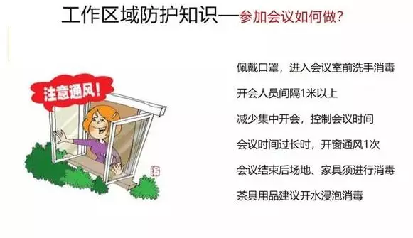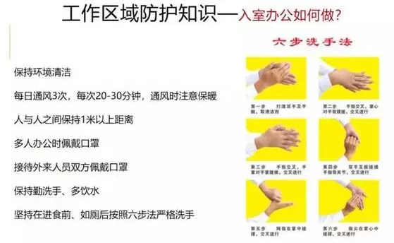 3、入室办公如何做 保持办公区环境清洁,建议每日通风3次,每次20-30分钟,通风时注意保暖。人与人之间保持1米以上距离,多人办公时佩戴口罩。保持勤洗手、多饮水,坚持在进食前、如厕后按照六步法严格洗手。接待外来人员双方佩戴口罩。