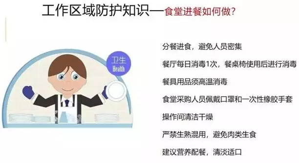 5、食堂进餐如何做 采用分餐进食,避免人员密集。餐厅每日消毒1次,餐桌椅使用后进行消毒。餐具用品须高温消毒。操作间保持清洁干燥,严禁生食和熟食用品混用,避免肉类生食。建议营养配餐,清淡适口。
