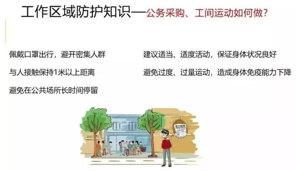 7、公务采购如何做 须佩戴口罩出行,避开密集人群。与人接触保持1米以上距离,避免在公共场所长时间停留。 8、工间运动如何做 建议适当、适度活动,保证身体状况良好。避免过度、过量运动,造成身体免疫能力下降。
