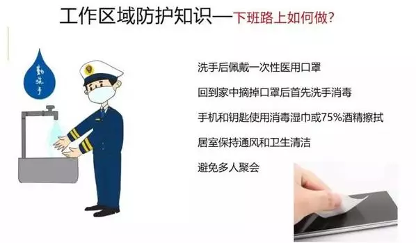6、下班路上如何做 洗手后佩戴一次性医用口罩外出,回到家中摘掉口罩后首先洗手消毒。手机和钥匙使用消毒湿巾或75%酒精擦拭。居室保持通风和卫生清洁,避免多人聚会。