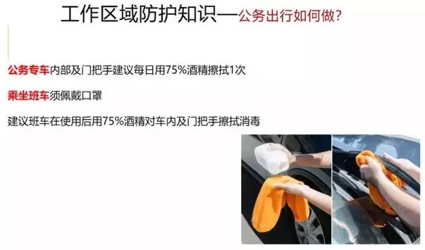 10、公务出行如何做 专车内部及门把手建议每日用75%酒精擦拭1次。乘坐班车须佩戴口罩,建议班车在使用后用75%酒精对车内及门把手擦拭消毒。