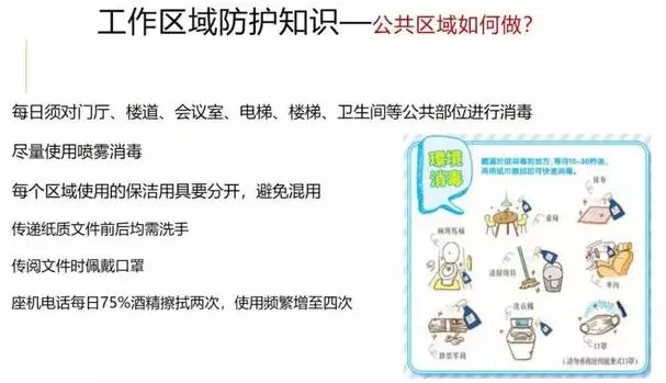 9、公共区域如何做 每日须对门厅、楼道、会议室、电梯、楼梯、卫生间等公共部位进行消毒,尽量使用喷雾消毒。每个区域使用的保洁用具要分开,避免混用。