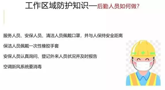 11、后勤人员如何做 服务人员、安保人员、清洁人员工作时须佩戴口罩,并与人保持安全距离。食堂采购人员或供货人员须佩戴口罩和一次性橡胶手套,避免直接手触肉禽类生鲜材料,摘手套后及时洗手消毒。保洁人员工作时须佩戴一次性橡胶手套,工作结束后洗手消毒。安保人员须佩戴口罩工作,并认真询问和登记外来人员状况,发现异常情况及时报告。