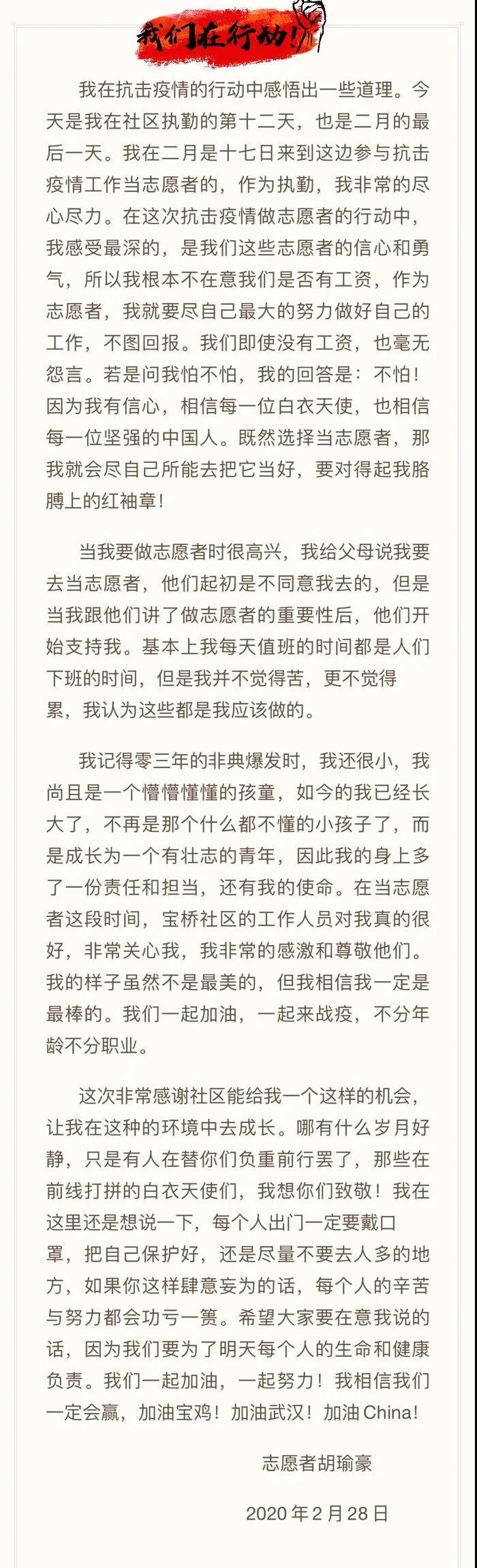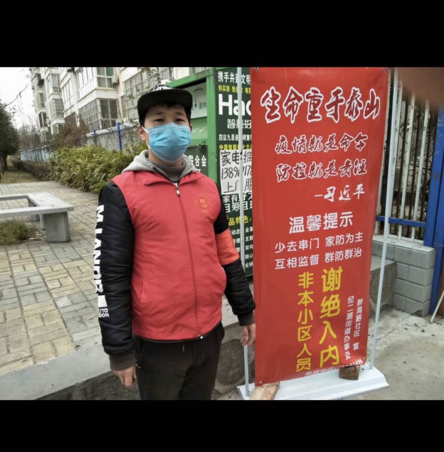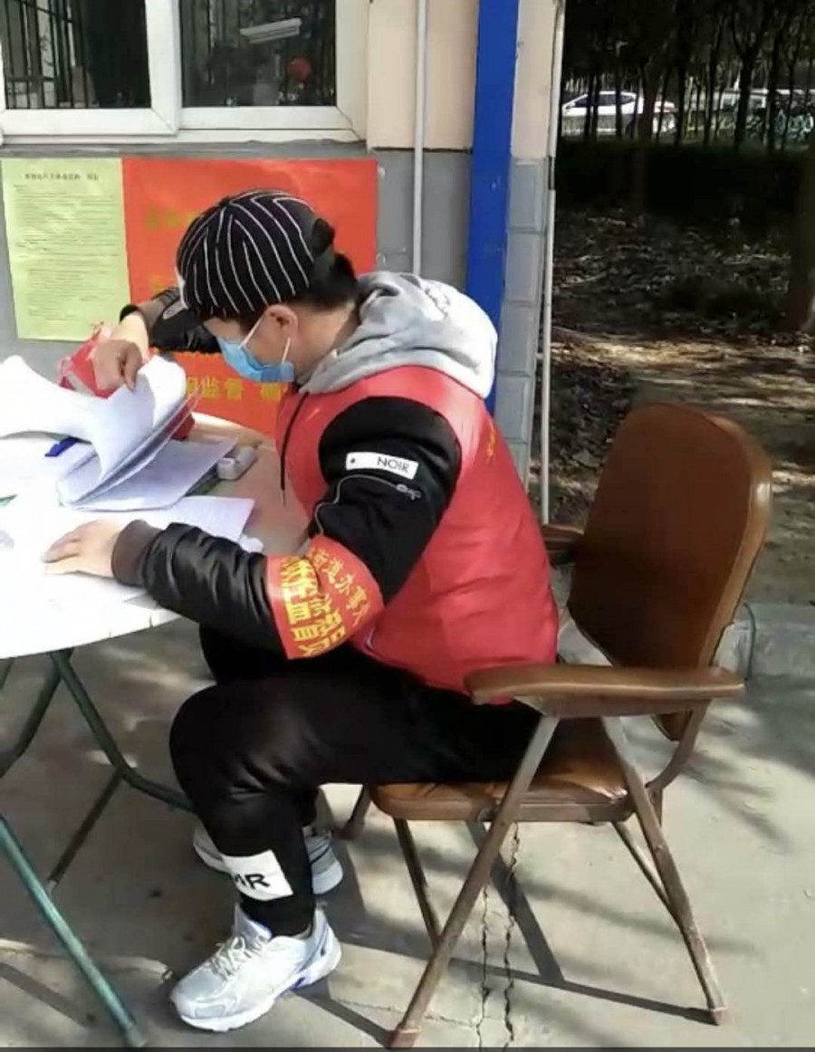 来自宝鸡秦华职业技术学校的胡瑜豪同学,同时他也是宝鸡慧芳公益发展中心的志愿者。自新型冠状病毒感染的肺炎疫情防控工作开展以来,胡同学和他的志愿者同伴们就积极参与到防疫工作之中。在严寒中,他们的眼睛被冻得流下眼泪,脚被冻得生疼,测温仪在低温下失灵,……他们擦干眼泪,贴上“暖贴”,把测温仪夹在温暖的腋窝下,依然坚持奋战在“抗疫”一线;为了减少上厕所的频率,在低温工作中连一口水也不敢喝的志愿者们却一遍遍的重复着:“您好,请出示一下小区出入证!”“您好,请做好登记,测量一下体温。”“您好,为了您和他人的健康,请不要出小区遛狗。”……小区、路口、白天、黑夜,一个个平凡而坚定的身影坚守在防疫第一线,他们坚信:认真做好执勤工作,守护好自己的家园,就能帮助祖国早日打赢这场没有硝烟的“战役”!