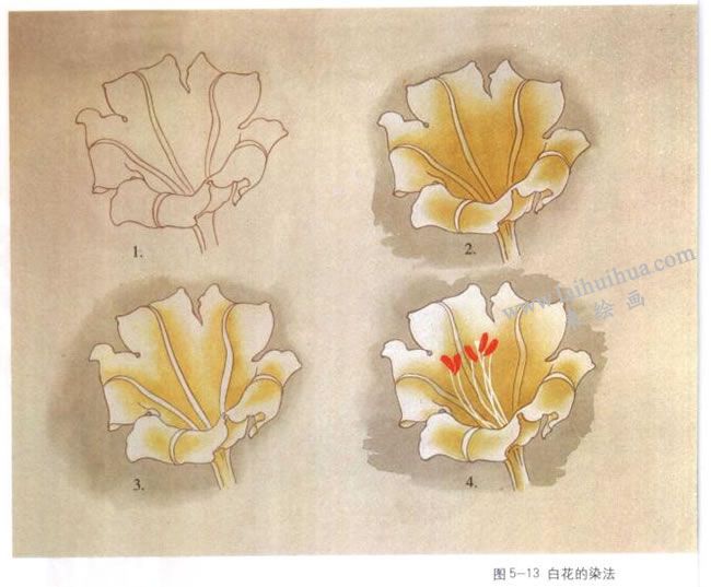 (1)白花的染法:以扎伊尔花为例。1.平涂:首先沿着外轮廓线用薄白粉平涂整个花朵,白粉的浓度要能透出所ffi住的墨线,如甶粉太厚,不易再在上面染色,还容易勾起白粉和泥。 2.分染芽绿:芽绿由藤黄加花青稍加些赭石或朱磲调成,也可再兑人少量三绿,这样调出来的芽绿有一定的饱和度,颜色更漂亮,按其明暗转折关系分染。 3.统染芽绿、提白:为了使花的体积更明确,用大面积的芽绿统染,形成筒状造艰。之后,从边缘处往回提白,这时的白粉可以稍厚些。 4.勾花丝、点花蕊、托色:用细笔蘸浓稠的白粉勾花丝,用饱和的朱磦点花药,点时要存一定的高度,干后可出凹槽,质感逼真。为了衬托白花的颜色,最后可在纸的背面,用较浓稠的白粉平涂。(图5-13)