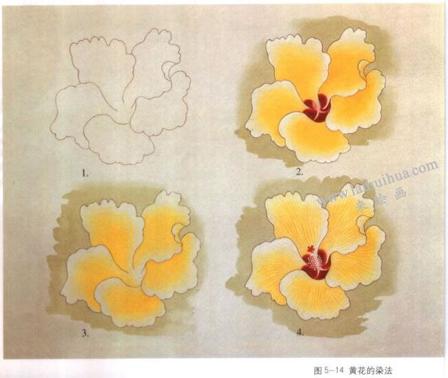 (2)黄色花的染法:以蜀葵花为例。1.平涂薄白粉。 2.正面花瓣分染藤黄,二至三遍,最后一遍分染藤黄时可兑人少睛的朱磦或赭石,颜色要保持一定的鲜嫩,忌染焦躁。反面染一二遍藤黄即可。 3.花瓣边缘提染白粉,用胭脂分染花瓣基部。 4.用白粉勾花筋,立粉法点花蕊。(图5-14)