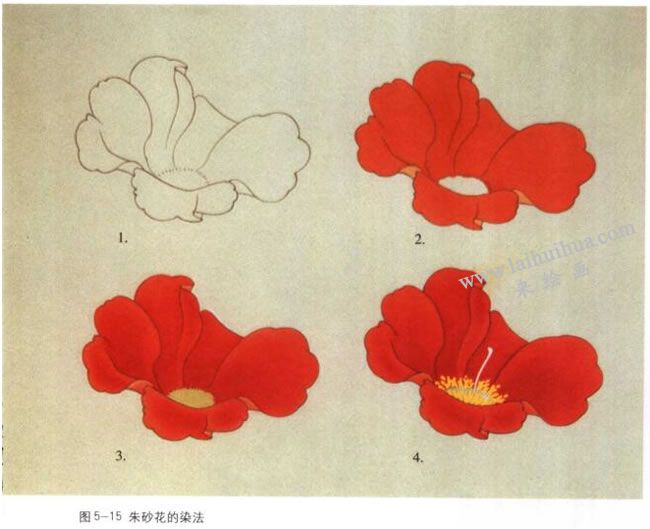 (3)朱砂花的染法:以红山茶花为例。1.用较重的墨色勾出花型。 2.正瓣平涂朱砂,反瓣平涂朱磦。 3.正瓣分染曙红,反瓣分染朱砂,花中央平涂淡草绿。 4.浓白粉勾花丝,藤黄加白粉点花蕊,花的背面可用朱磲加白粉托色。(图5-15)