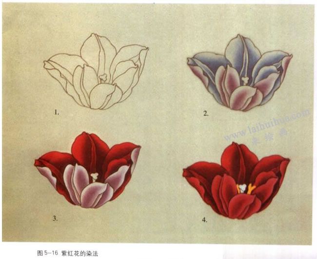 (4)紫红色花的染法:以郁金香花为例。1.用重墨勾出花的轮廓。 2.花青分染正瓣(亦可用墨色分染,花育打底的颜色偏冷,墨色则较暖),花青加曙红分染反瓣。 3.在正瓣分染、统染花青的基础上,分染洋红数遍后,平涂洋红。反瓣提白。 4.反瓣分染洋红,再罩染洋红。用藤黄加白粉点花蕊,最后可在花的背面托水粉靑莲。(图5-16)